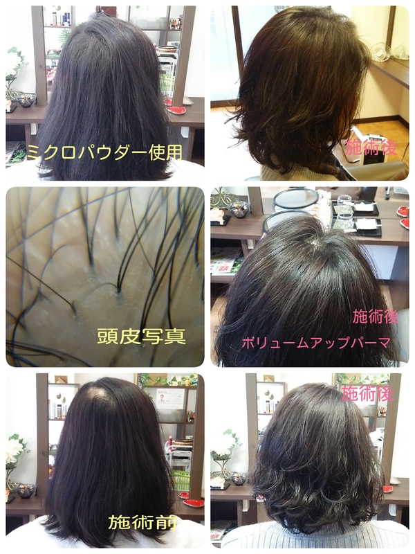 全て同じ人です。 左の写真3枚は施術前です。ミクロパウダーを使用しただけでも、薄く見える部分が隠れます。 しかし、施術後の写真3枚同じ方とは思えないぐらいボリュームが出て、毛先のパーマもきれいに出て、とってもエレガントになりました。