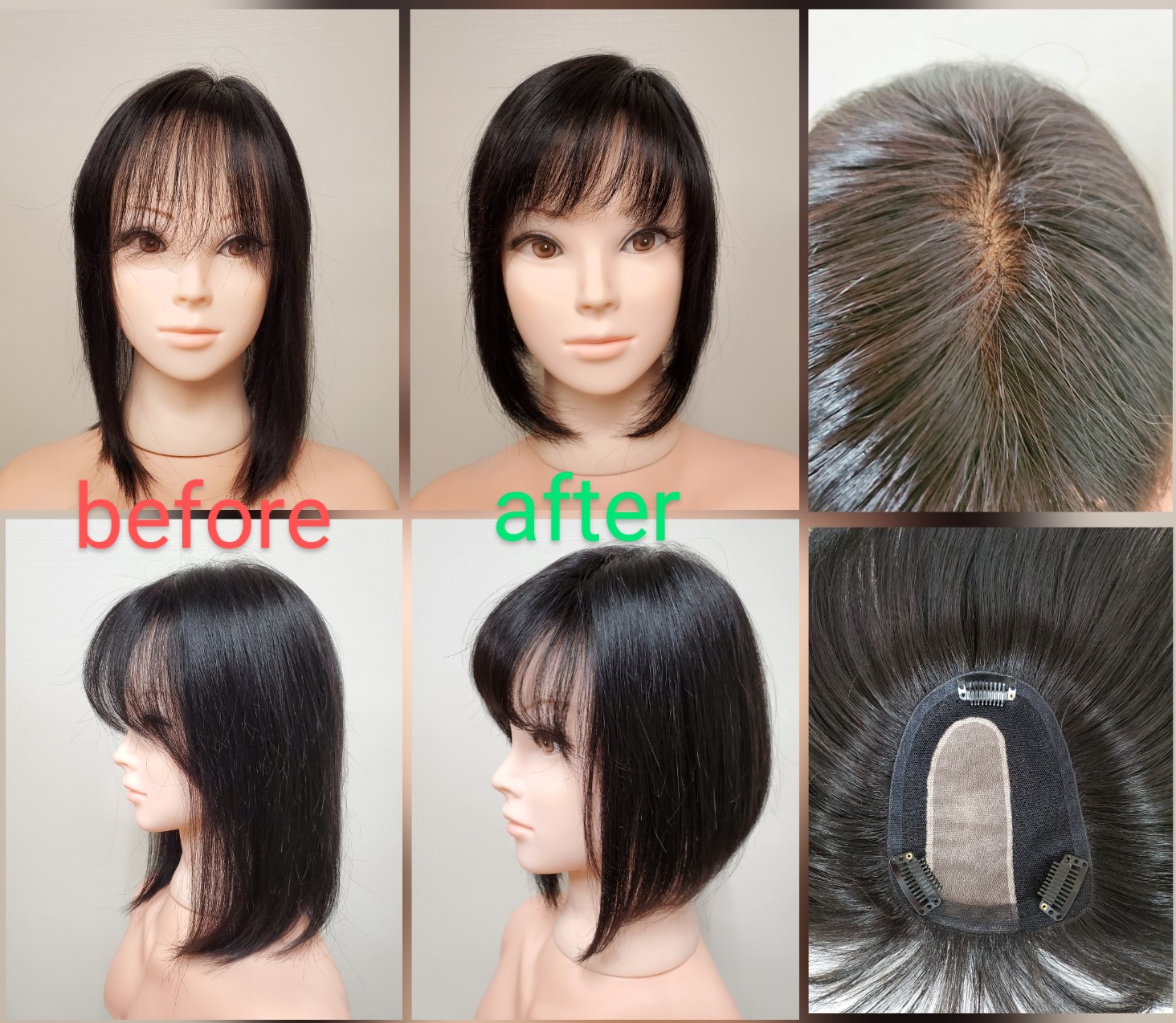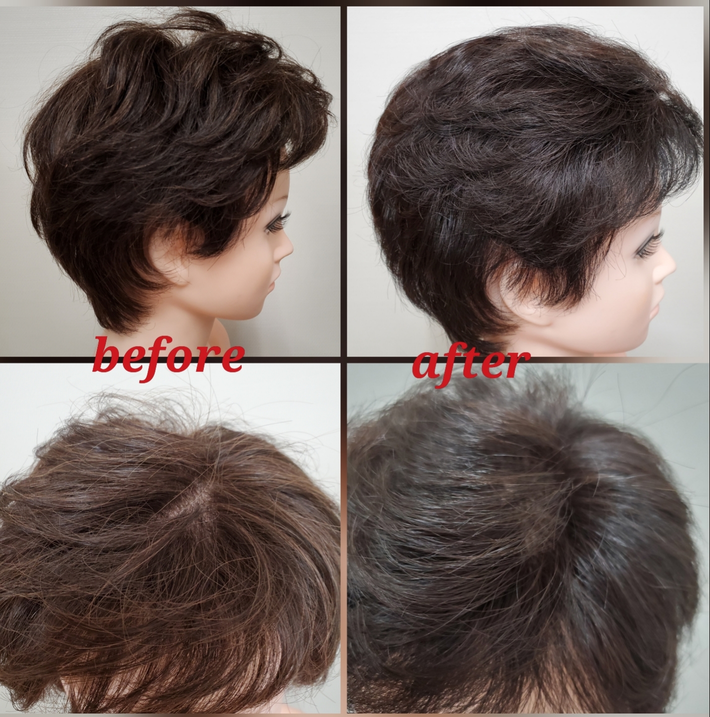 ウィッグが明るくなって、ウィッグカラーの依頼と、サイドの膨れが落ち着かないとのことでしたので、長さだけカットして右サイドの膨らみを調整しました。