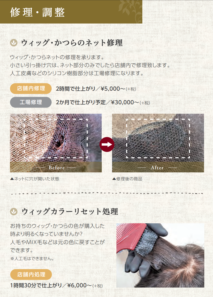 医療用ウィッグ・かつらのネット修理と褪色したウィッグのカラーリメイク