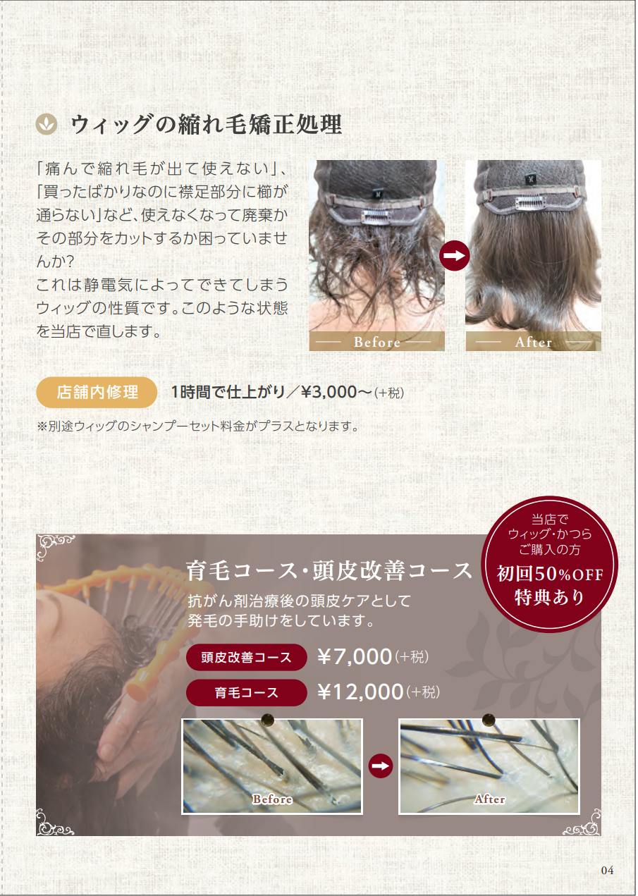 医療用ウィッグ・かつらの縮れ直しと育毛コース・頭皮改善コース