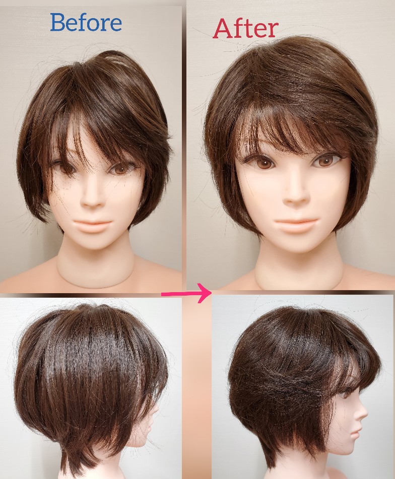 カットは前髪の長さと人工毛特有のテカリを押さえるために表面をぼかしカットをしました。